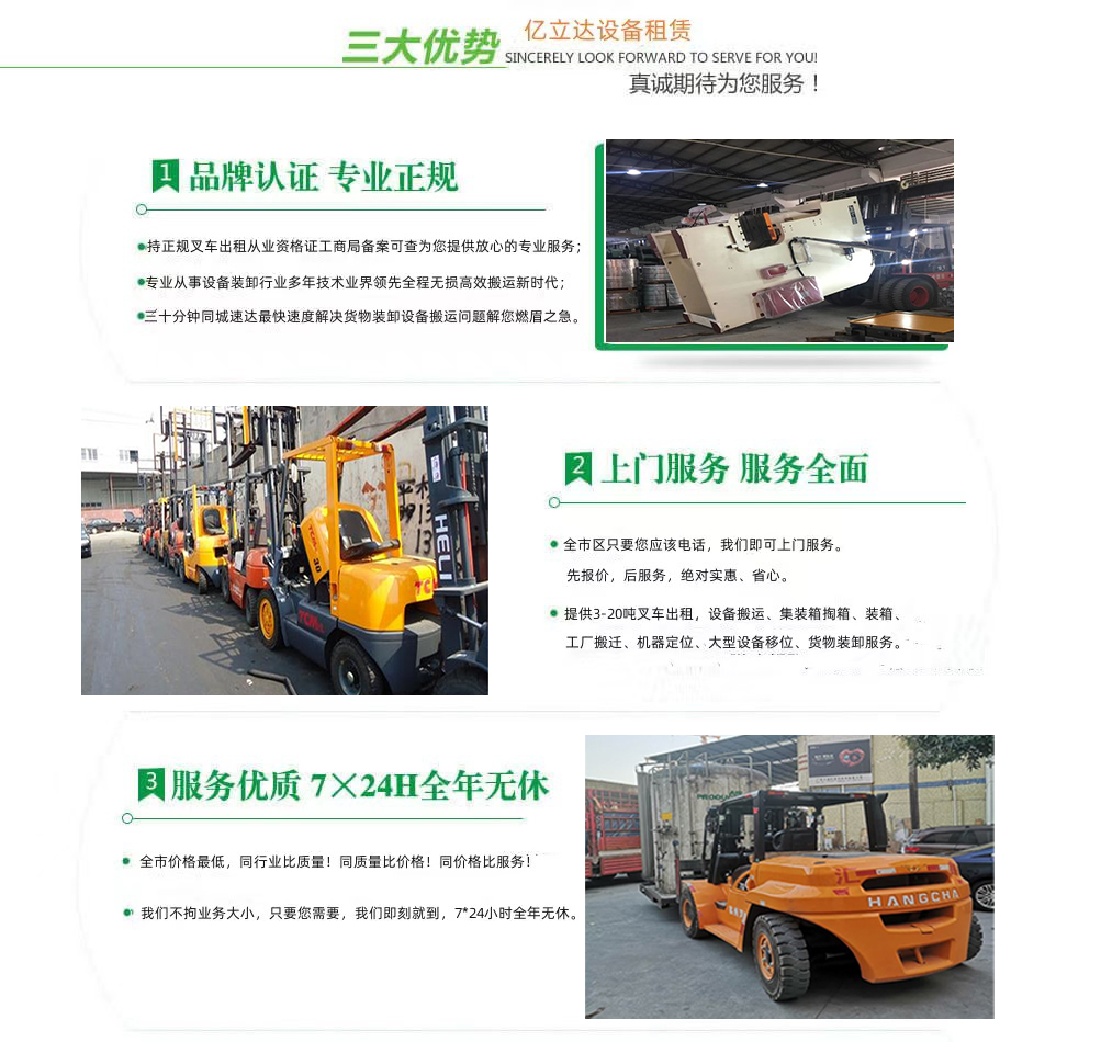 亿立达设备租赁有限公司是工商局准许的北京培黎职业学院专业叉车出租公司,公司本着诚信、服务、效率、创新的经营理念,用精湛的技术,真诚的服务,为众多客户提供优质的服务,同时获得信赖与支持。专业提供北京培黎职业学院3-20吨叉车出租、叉车租赁、设备搬运、集装箱掏箱装箱、机器移位定位、货物装卸、工厂搬迁、安全可靠,收费透明,价格便宜,随叫随到,24小时上门服务!本公司叉车吊车师傅对各种设备搬运装卸都有深刻探讨和研究。很多的疑难设备搬运,通过我公司的叉车师傅都能迎刃而解。对各种进口设备、国产机器、大型设备搬迁、高难度搬迁、各种精密仪器、医疗设备、科研设备等都能搬运; 提供全市 24 小时上门装卸搬运服务。同时提供厂房搬迁服务。 ...